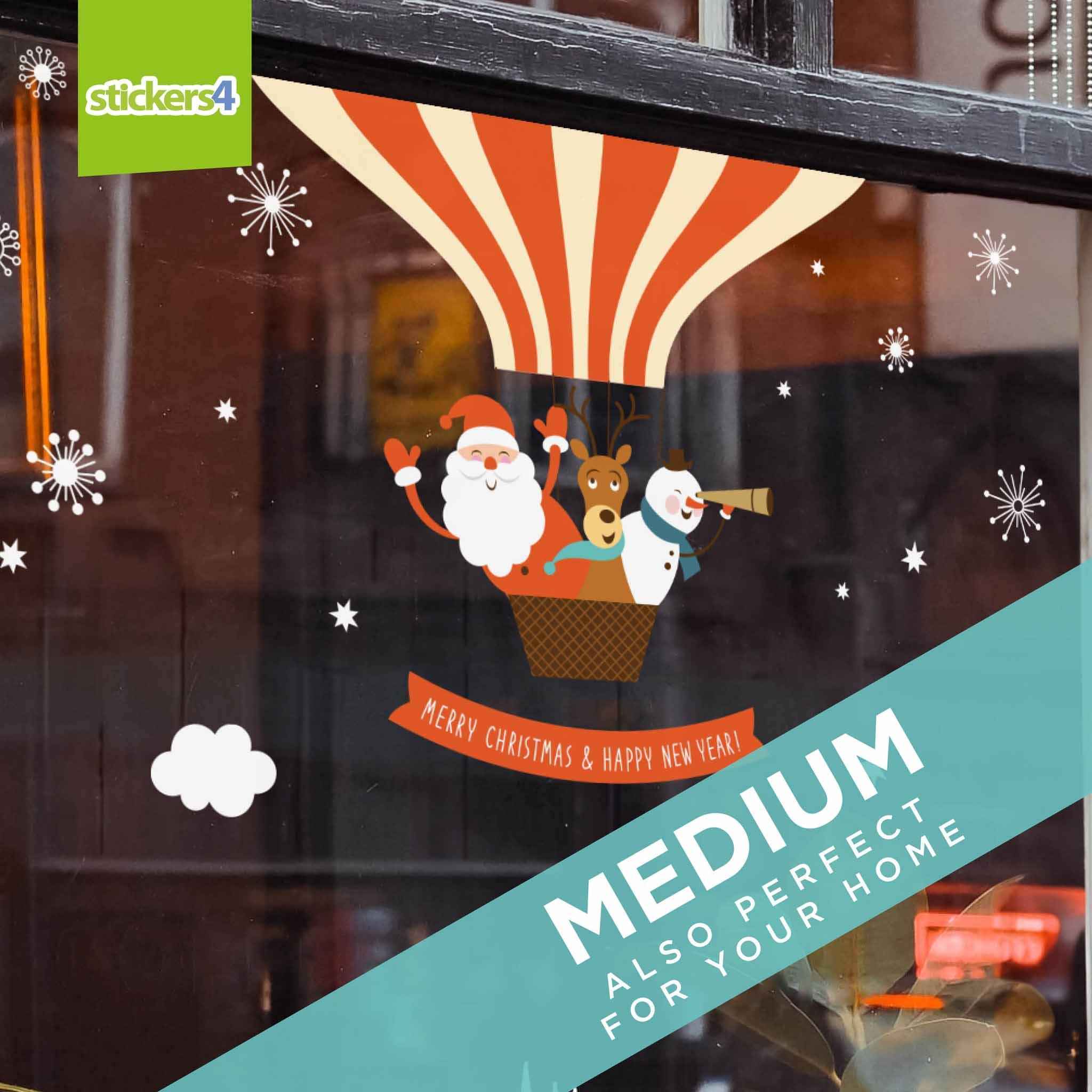 A brilliant Christmas Hot Air Balloon with Snow'n'Stars double-sided static cling window sticker, available in a range of sizes to suit all windows. Perfect for retail shop windows as well as for use at home - your kids will love this! Very easy to apply and reusable, simply re-apply to the backing sheet after use and this decal can be used year after year (so amazing value for money!)
