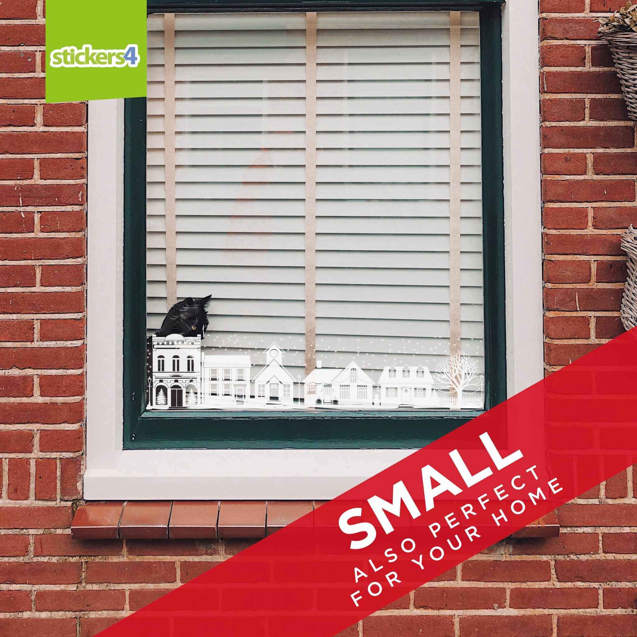 Bring a charming holiday display to any window with this festive Christmas Village Street Scene window sticker. Perfect for decorating for the season, it creates an enchanting wintery atmosphere and adds a cheerful touch to your home. This beautiful Christmas Village Street Scene is available in 2 sizes to suit most windows. The design is printed in white to clear static cling for application to the inside of the window to be seen from the outside.