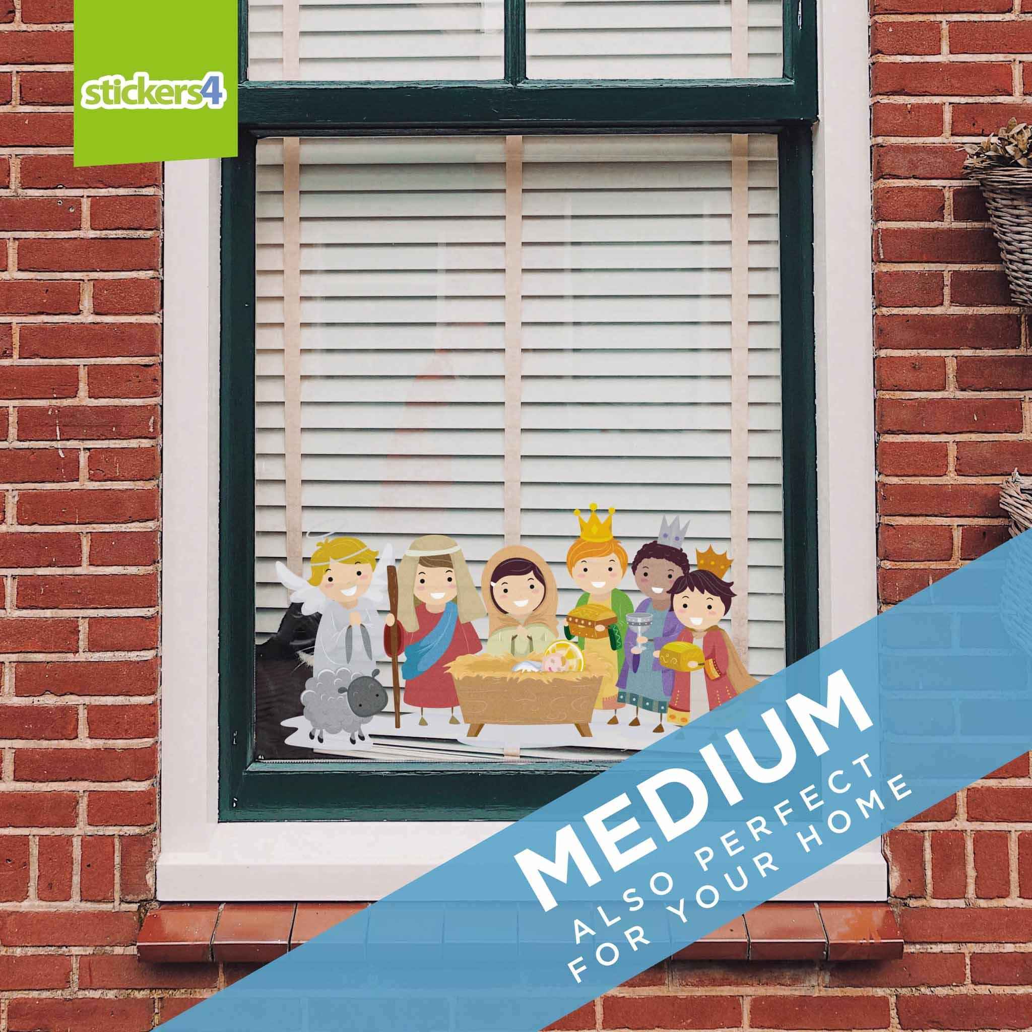 A wonderful colourful static cling Nativity Scene. Available in a range of sizes. Easy to apply and reusable, simply re-apply to the backing sheet after use and this decal can be used year after year.