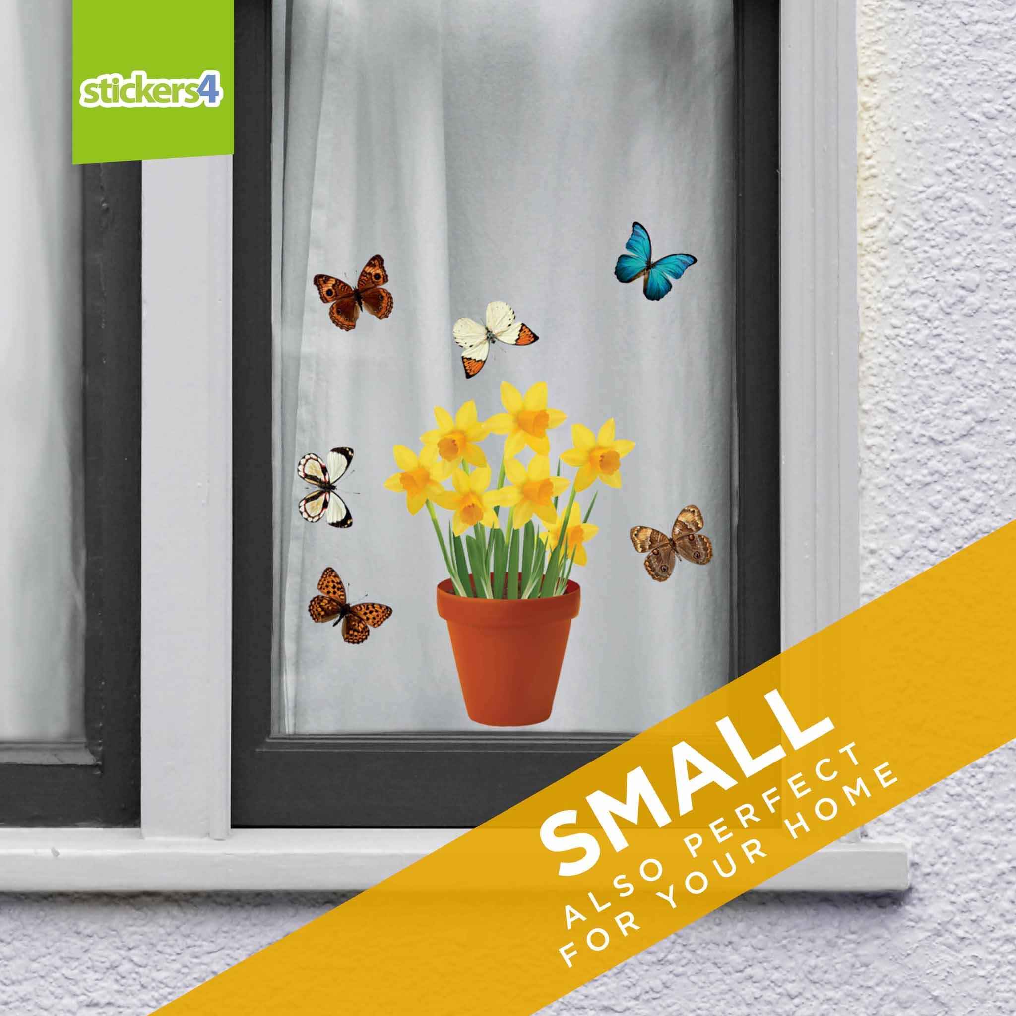 A stunning full colour DOUBLE-SIDED window sticker of Daffodils in a Pot. This is printed to static cling material and backed in white to make the colours really stand out. This window cling is applied to the inside of the glass to be seen from the outside and because there is no adhesive the sticker can be removed and reapplied many times. You can even put it back on the backing sheet and save it!