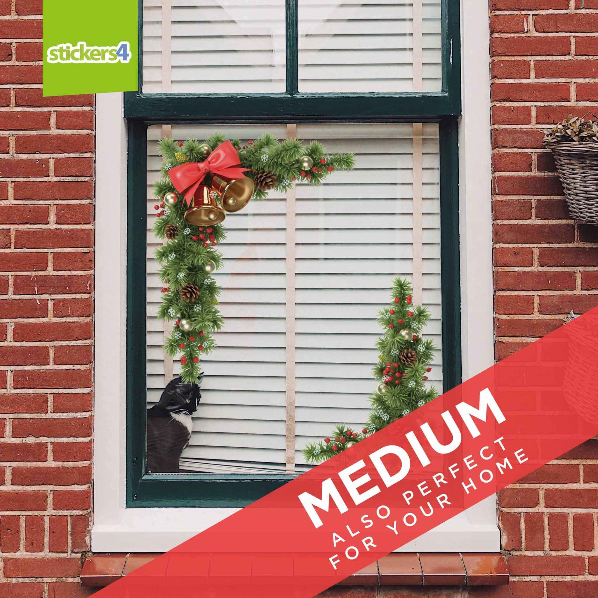 A stunning set of 2 Fir, Cones & Bells static cling corner window stickers, available in a range of sizes to suit all windows. Perfect for retail shop windows as well as for use at home. Very easy to apply and reusable, simply re-apply to the backing sheet after use and this decal can be used year after year (so amazing value for money!)