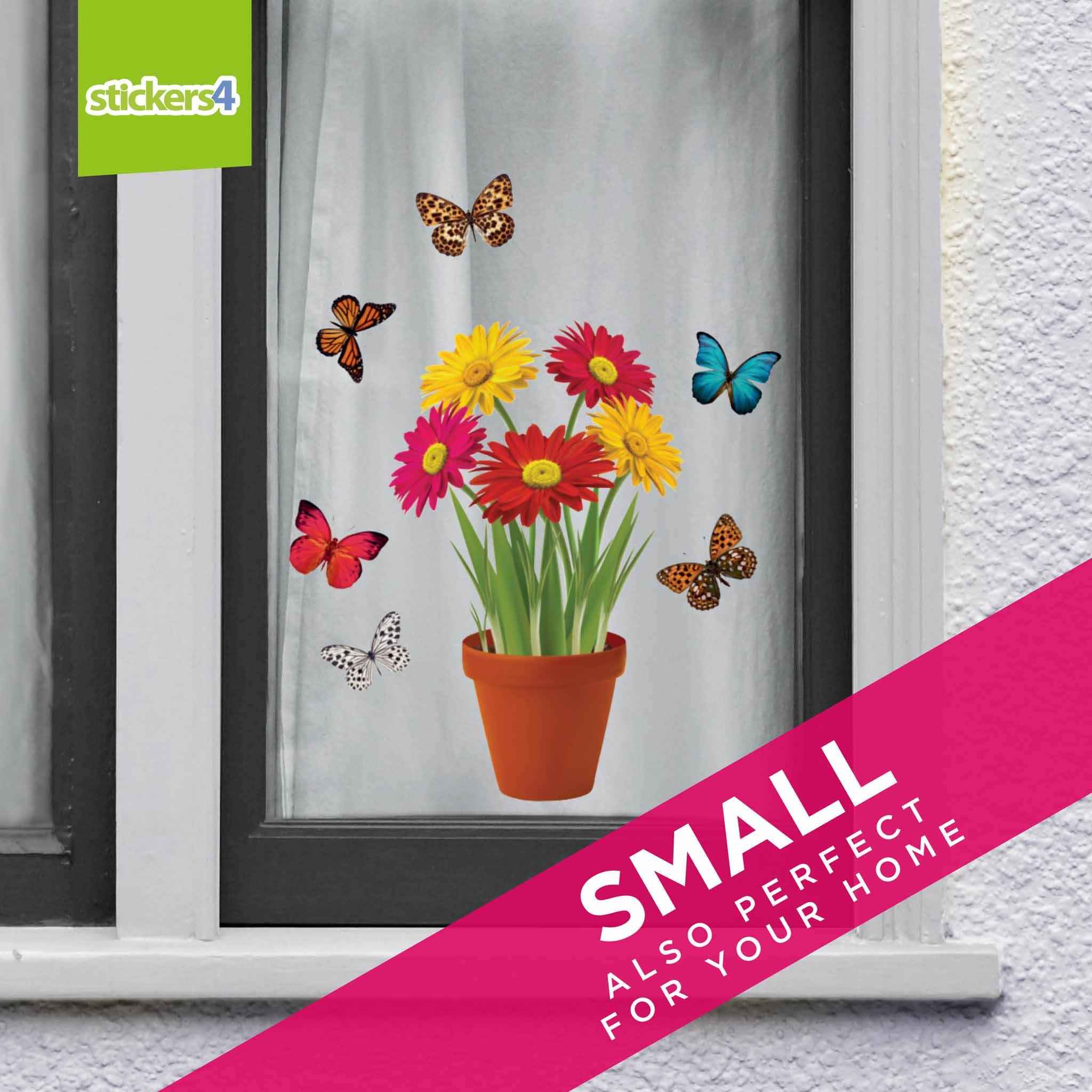 A stunning full colour DOUBLE-SIDED window sticker of Gerberas in a Pot. This is printed to static cling material and backed in white to make the colours really stand out. This window cling is applied to the inside of the glass to be seen from the outside and because there is no adhesive the sticker can be removed and reapplied many times. You can even put it back on the backing sheet and save it!