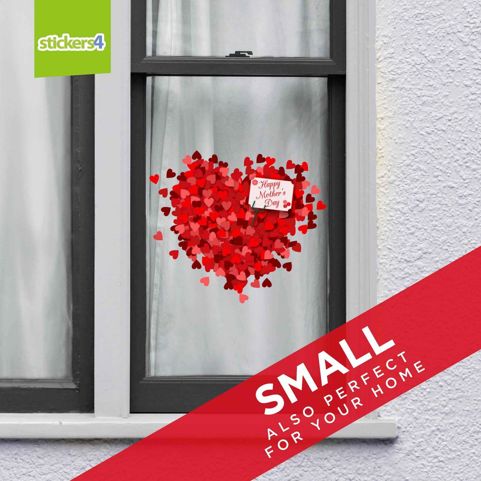 A Mother's Day heart made up of lots of small hearts with a Happy Mother's Day note, available in two sizes. Easy to apply to the inside of the window (to be read from the outside) and is reusable!