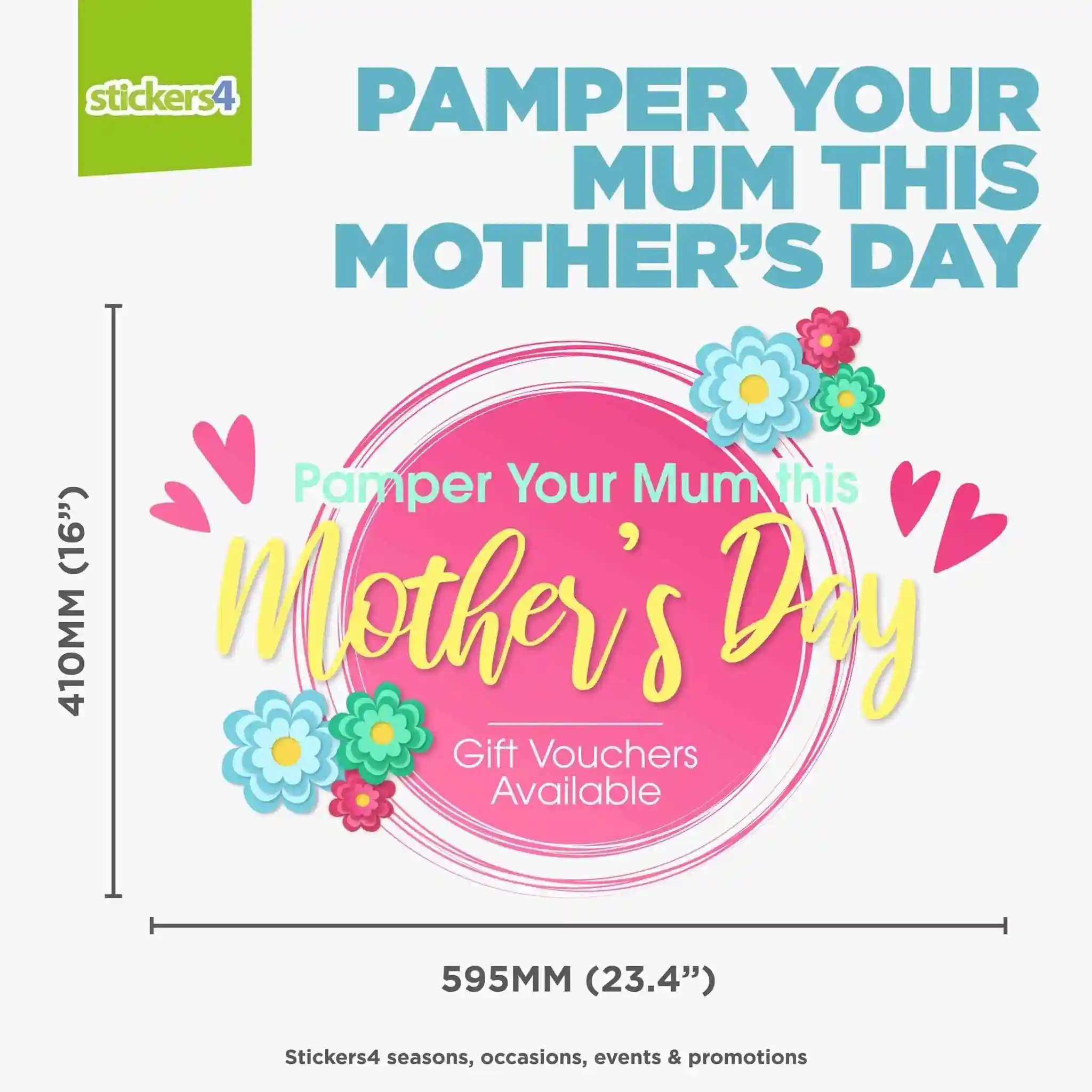 Perfect for Hair & Beauty salons, Nail clinics and all other Pampering Parlours (!) this lovely design will make an eye-catching display for your Mother's Day window. We also have an add-on pack of individual flower and heart decals to co-ordinate with this design here or select from the dropdown above