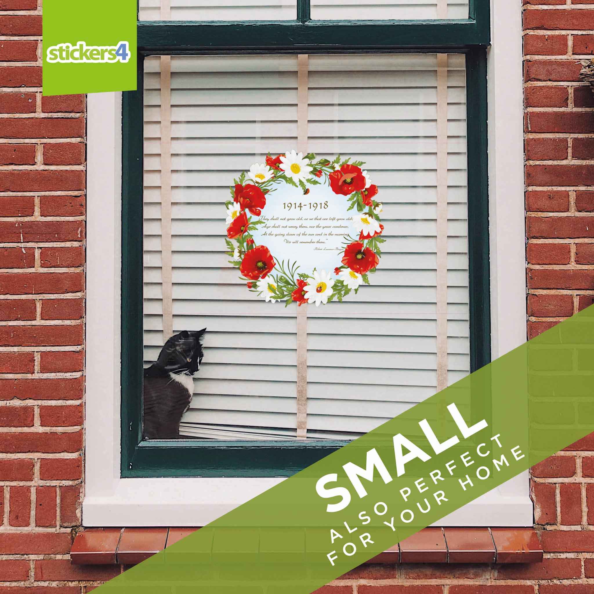 A lovely full colour Poppy & Daisy Remembrance Wreath static cling window sticker. This item is reverse printed and backed in white for application to the inside of your window to be seen from the outside. (We're unable to do a double-sided print of this item)