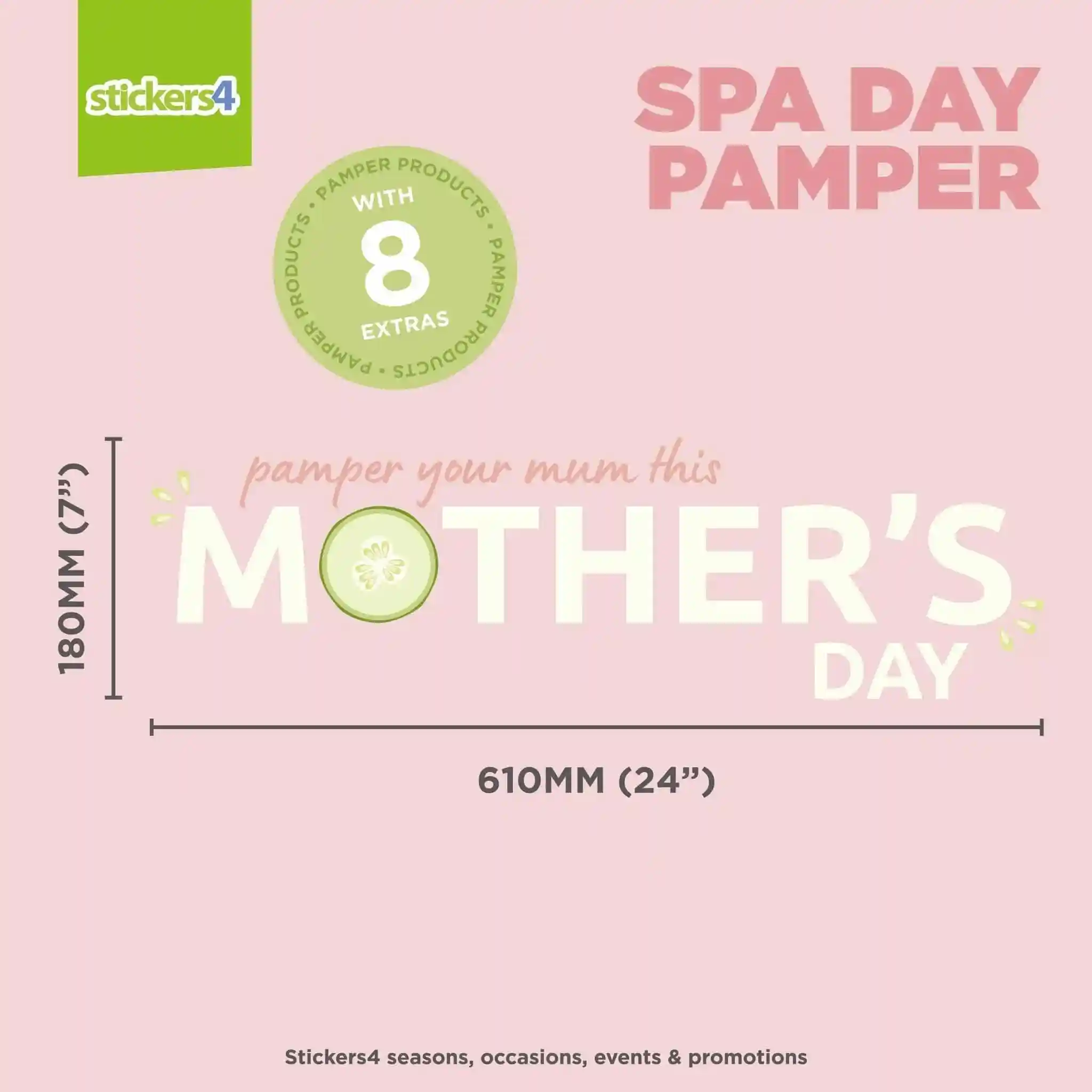 Introducing our "Spa Day Pamper Window Stickers," the perfect way to invite relaxation and indulgence into your mother's life this Mother's Day. Featuring the central message "Pamper Your Mum This Mother's Day" surrounded by eight additional stickers showcasing an assortment of face creams and masks window stickers.