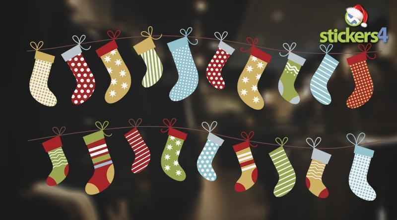 A DOUBLE set of vintage style hanging stockings printed in colour to cling vinyl for application to the inside of your window.